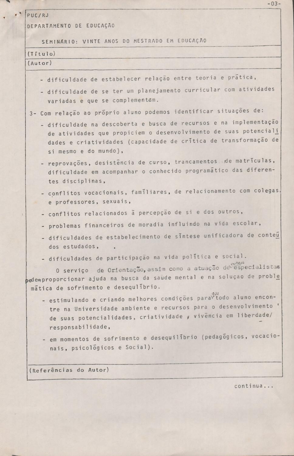 Artigo intitulado 'SOE/UNICAMP: Uma realidade de orientação educacional no 3º grau' de autoria da orientadora educacional Zilda Santesso, apresentado no seminário dos 20 anos do mestrado em Educação da PUC-Rio.
