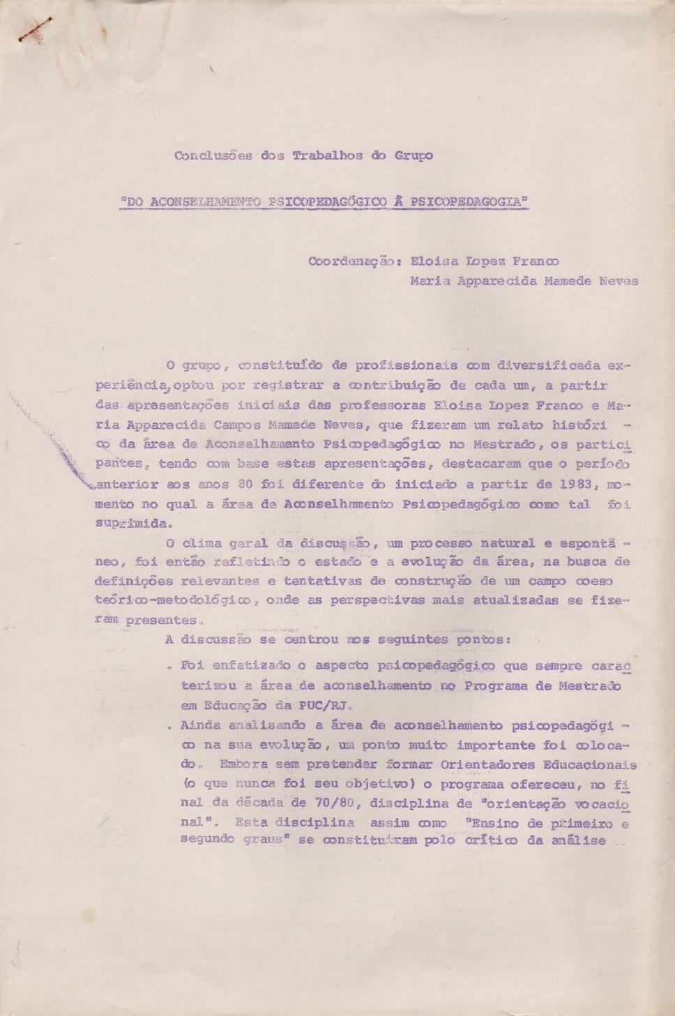 Artigo intitulado 'Do aconselhamento psicopedagógico à psicopedagogia' de autoria das professoras Eloisa Lopez Franco e Maria Apparecida Campos Mamede Neves, apresentado no seminário dos 20 anos do mestrado em Educação da PUC-Rio.