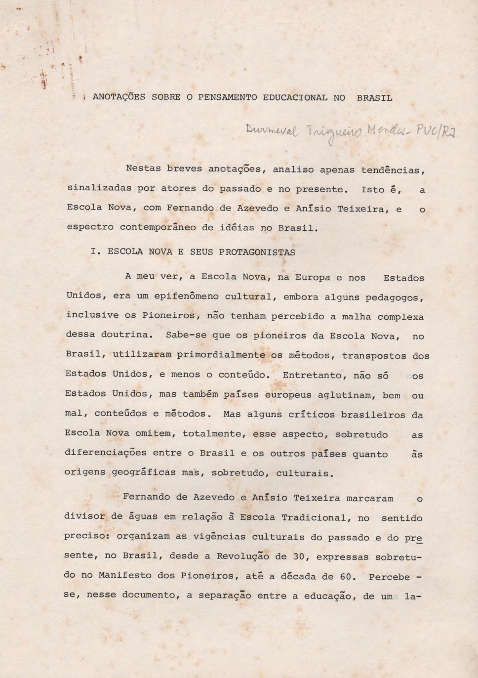 Artigo intitulado 'Anotações sobre o pensamento educacional no Brasil' de autoria do professor Durmeval Trigueiro Mendes, apresentado no seminário dos 20 anos do mestrado em Educação da PUC-Rio.