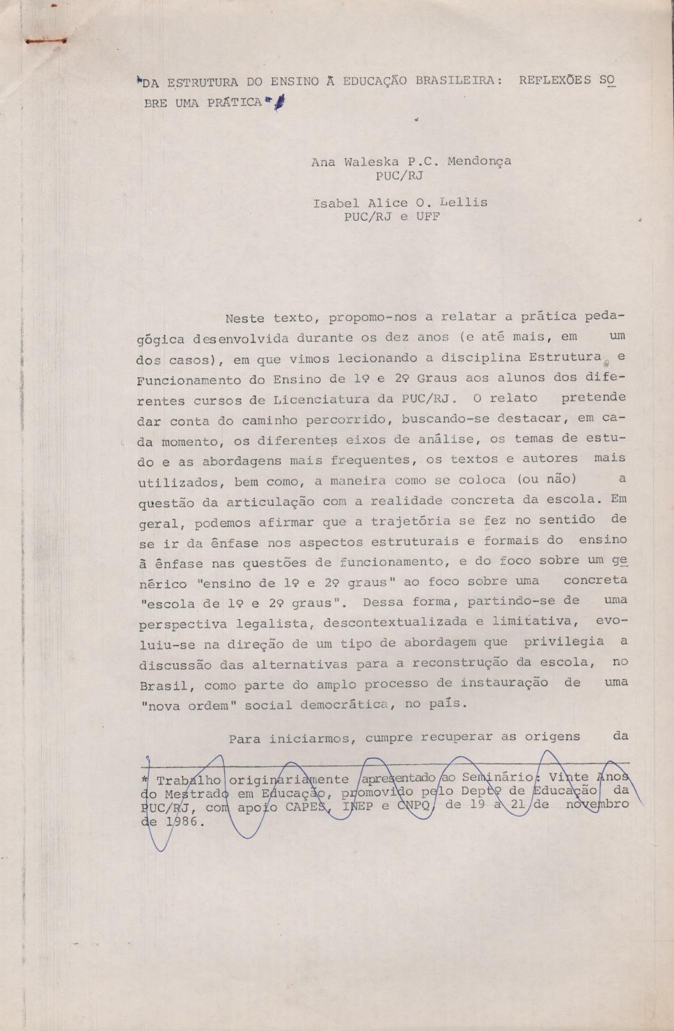 Artigo intitulado "Da estrutura do ensino à educação brasileira: reflexões sobre uma prática" de autoria das professoras Ana Waleska Mendonça e Isabel Alice Lellis, apresentado no seminário dos 20 anos do mestrado em Educação da PUC-Rio.