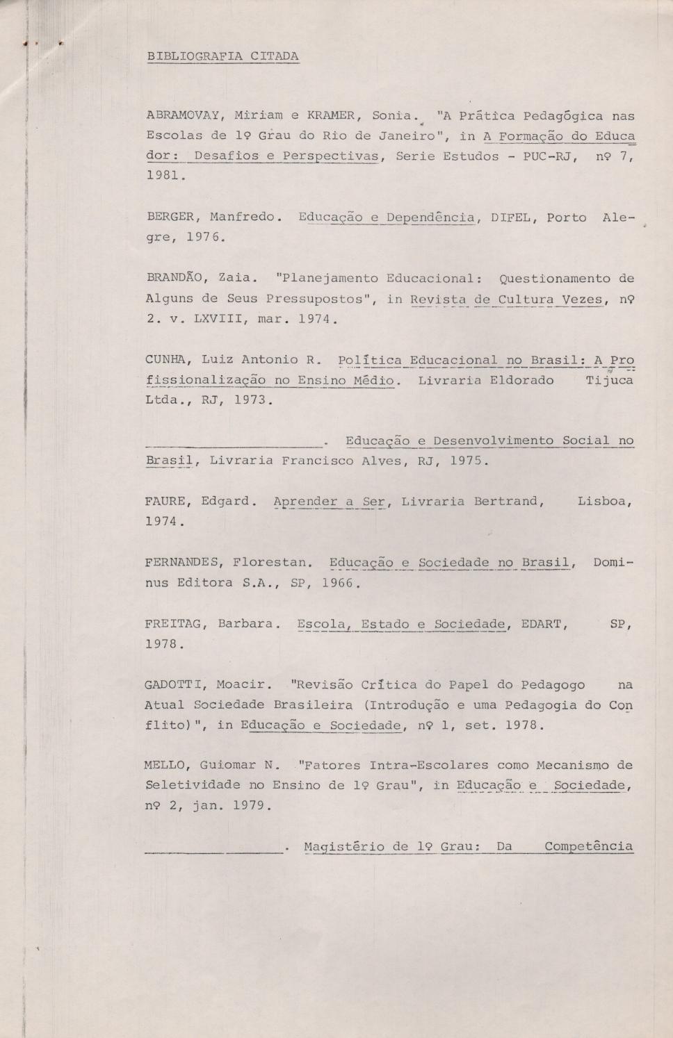 Bibliografia do artigo intitulado 'Da estrutura do ensino à educação brasileira: reflexões sobre uma prática' de autoria das professoras Ana Walesca Mendonça e Isabel Alice Lellis, apresentado no seminário dos 20 anos do mestrado em Educação da PUC-Rio.