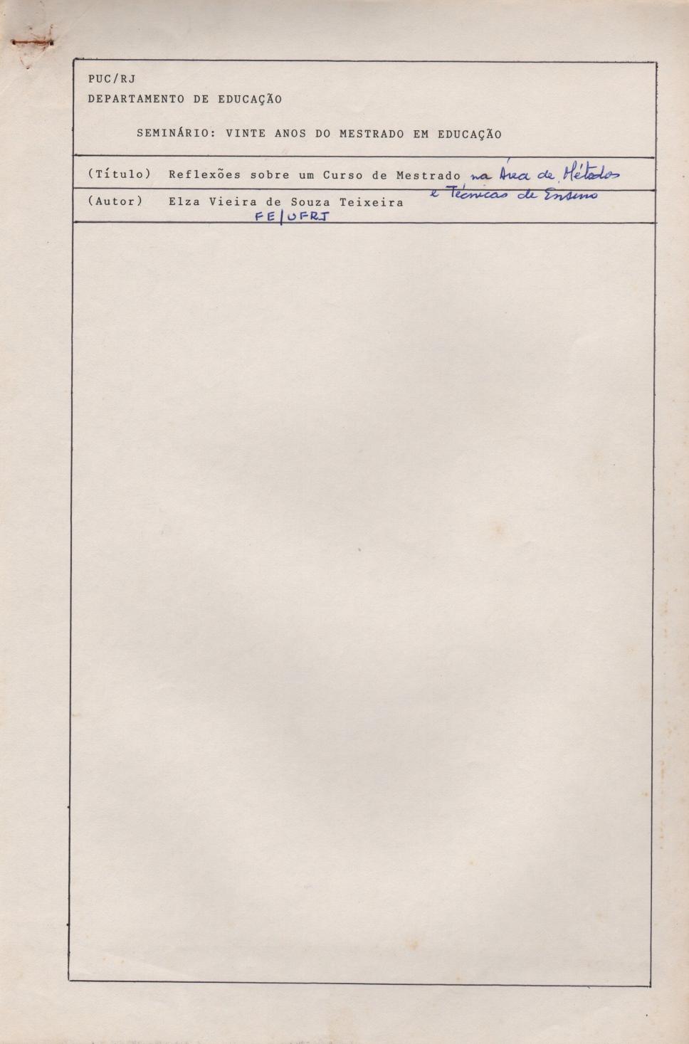 Artigo intitulado 'Reflexões sobre um curso de mestrado na área de Métodos e Técnicas de Ensino' de autoria da professora Elza Vieira de Souza Teixeira, apresentado no seminário dos 20 anos do mestrado em Educação da PUC-Rio.