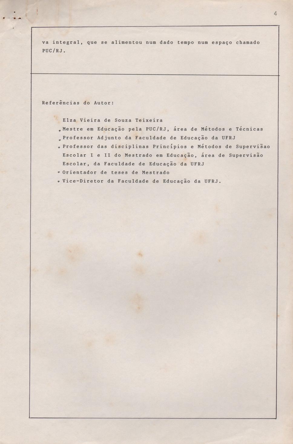 Artigo intitulado 'Reflexões sobre um curso de mestrado na área de Métodos e Técnicas de Ensino' de autoria da professora Elza Vieira de Souza Teixeira, apresentado no seminário dos 20 anos do mestrado em Educação da PUC-Rio.