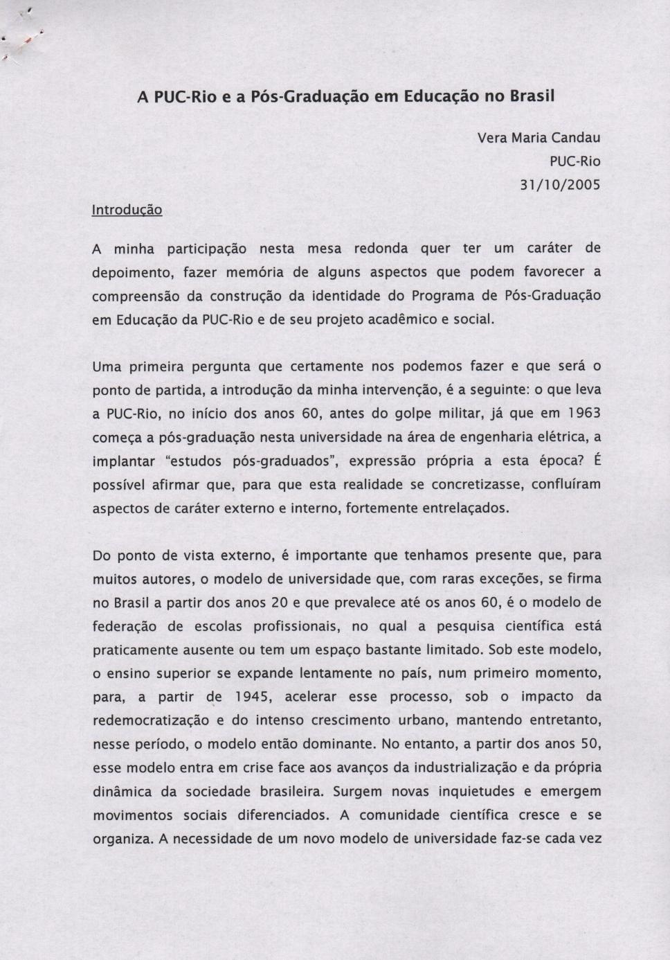 Artigo da professora Vera Candau intitulado 'A PUC-Rio e a Pós-Graduação em Educação no Brasil', que analisa o processo de implantação do programa de Pós-Graduação no Departamento de Educação da PUC-Rio.