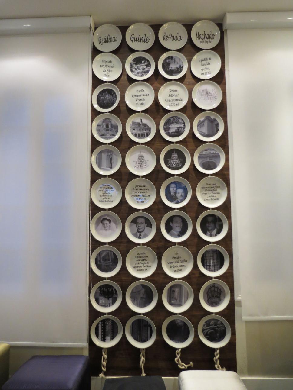Pratos em exposição na Casa Cor sobre a história do palacete da família Guinle de Paula Machado. Um dos pratos faz menção à idealização da PUC-Rio, então Faculdades Católicas, em 1940.