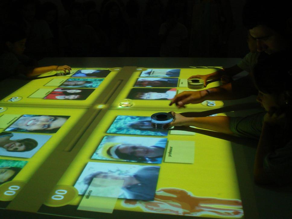 Alunos do Colégio Stockler interagem com a mesa da sala Jogos da Memória.