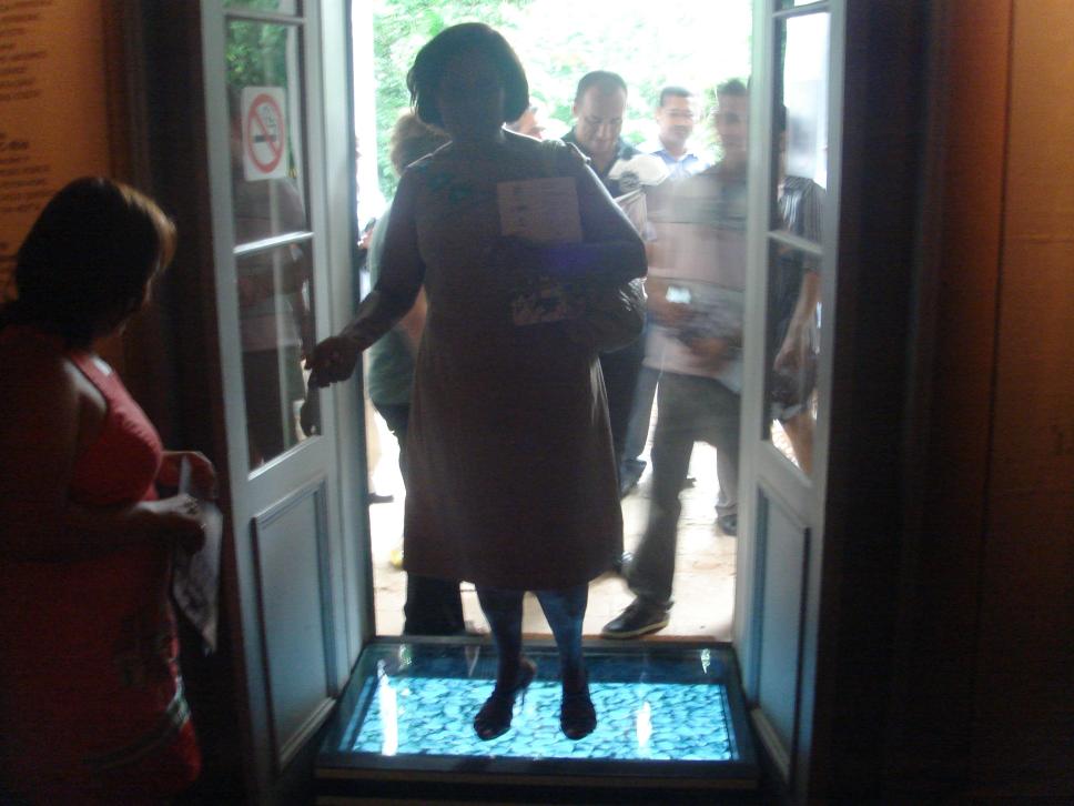 Alunos do curso de Licenciatura a distância do Departamento de História da PUC-Rio na porta de entrada da exposição.