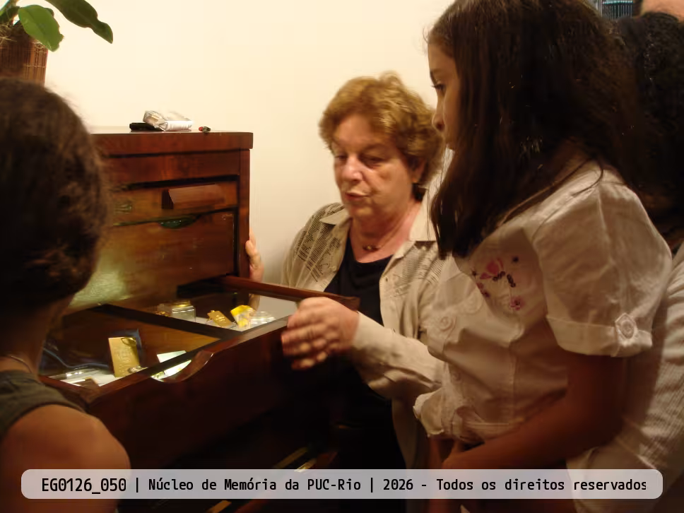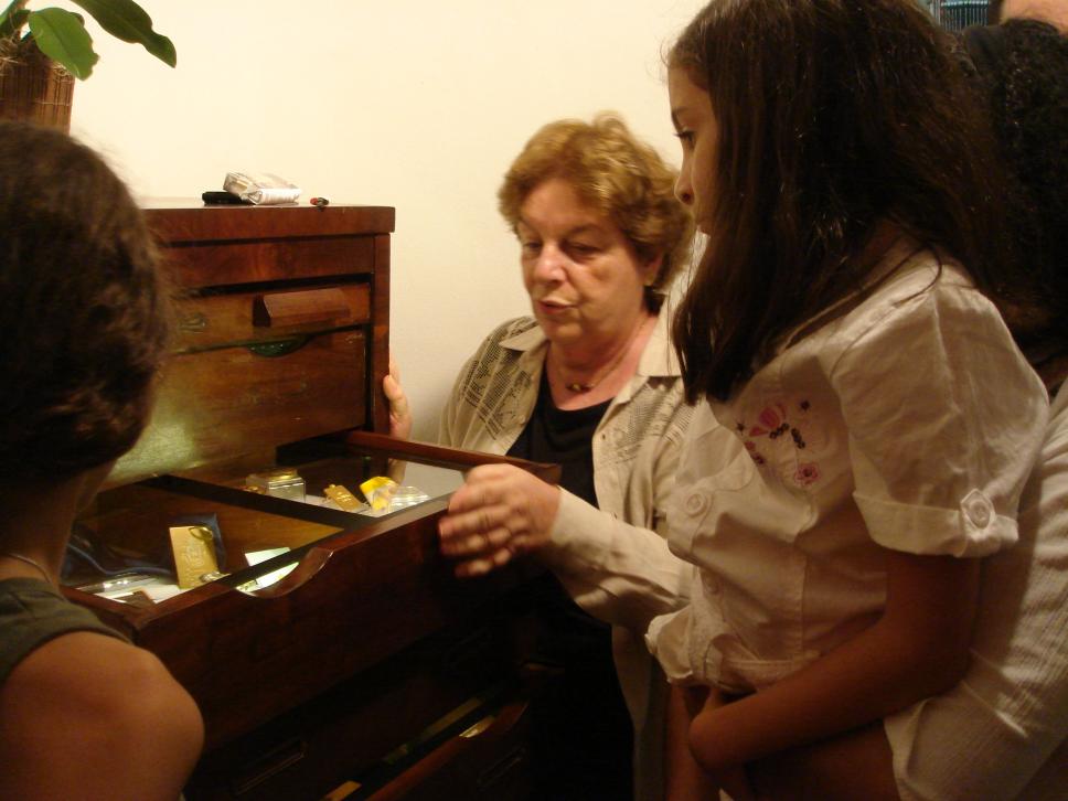 A professora Margarida de Souza Neves acompanha a visita da família do funcionário Tomás Guisasola, da Coordenação Central de Planejamento e Avaliação, à exposição.