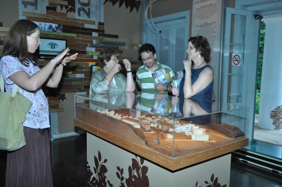 Professores do Departamento de Educação da PUC-Rio observam a maquete do campus Gávea.