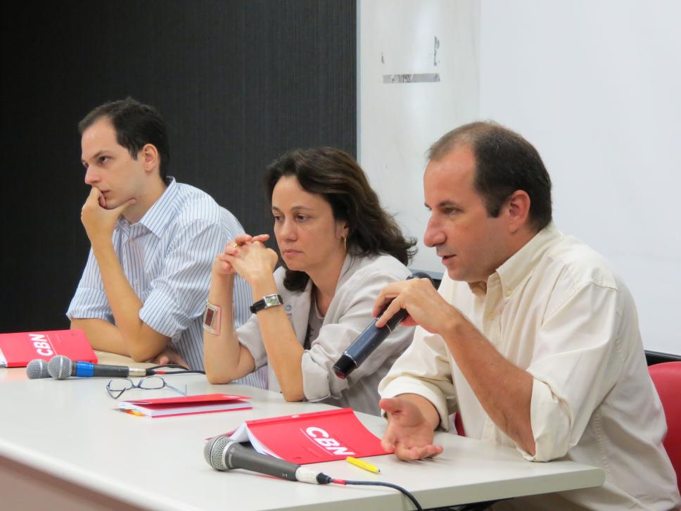 prof. Julio Lubianco (Chefe de reportagem do site CBN e prof. do curso de Jornalismo da PUC-Rio), Mariza Tavares (Diretora nacional de jornalismo da Rádio CBN) e Álvaro Oliveira Filho (Gerente nacional de esportes e jornalismo da CBN)