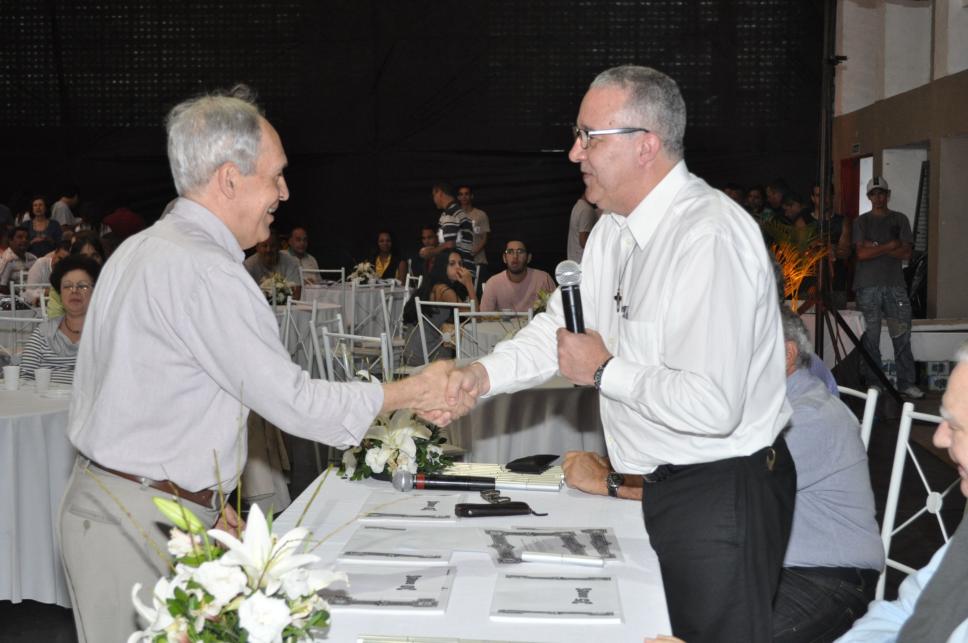 Funcionário recebe os cumprimentos do Reitor Padre Josafá S.J. durante a homenagem.