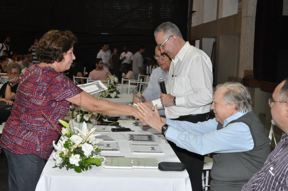 A funcionária Maria de Lourdes recebe os cumprimentos do Padre Ivern S.J. pelos 40 anos de dedicação à PUC-Rio.