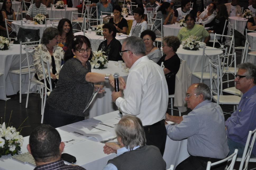A funcionária Edna Maria de Lima recebe o diploma de Honra ao Mérito pelos 35 anos de dedicação à PUC-Rio.