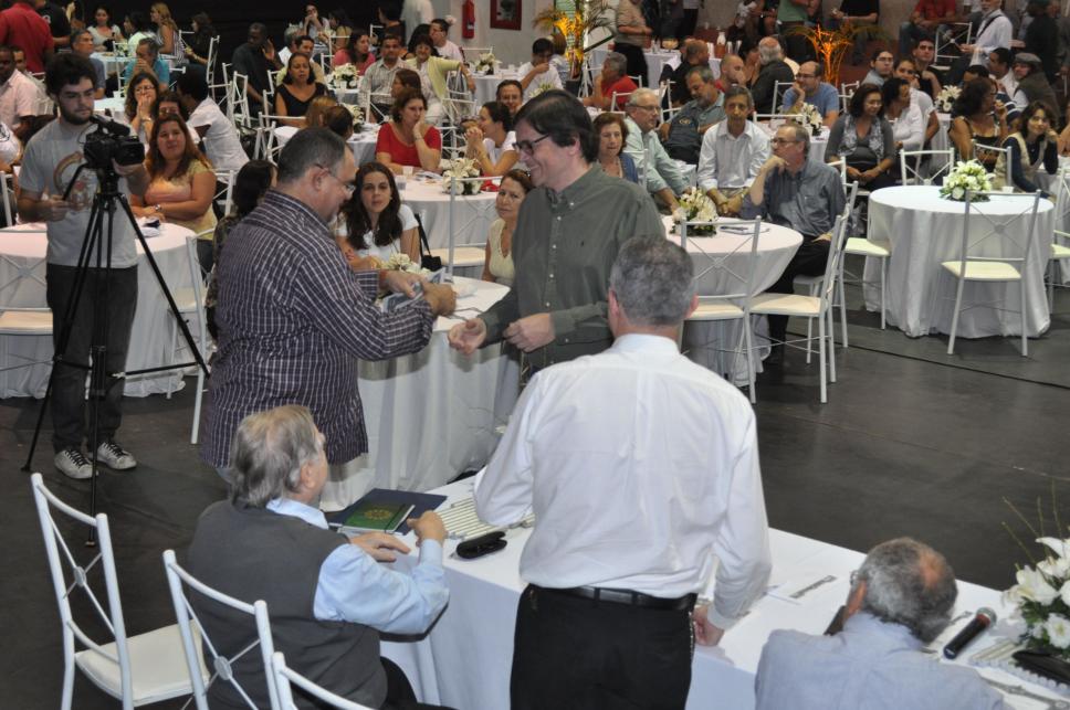 O professor Flavio Hasselmann recebe o diploma de Honra ao Mérito pelos 35 anos de dedicação à PUC-Rio.