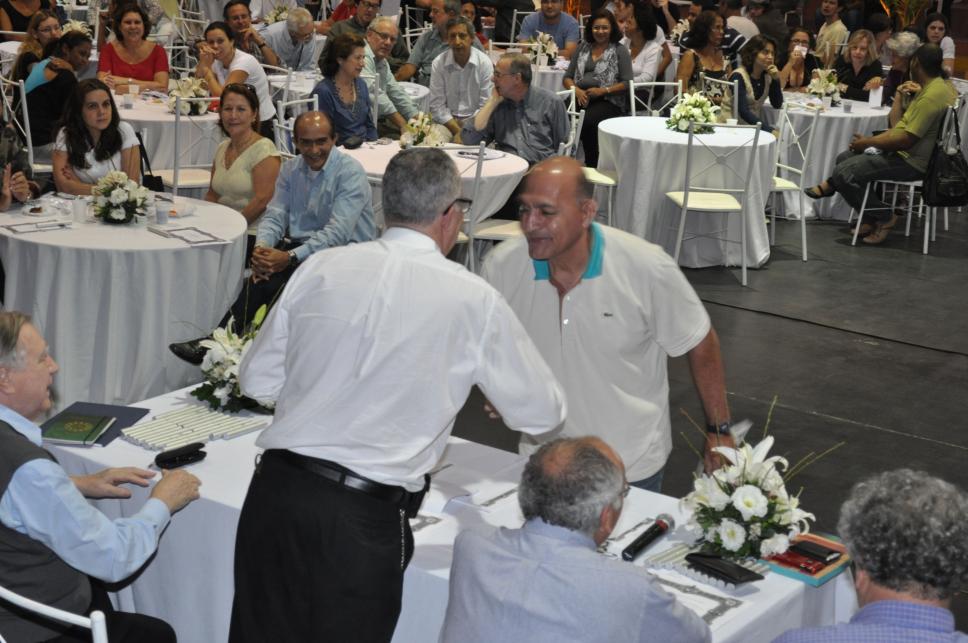O funcionário José Jorge da Rocha recebe os cumprimentos do Padre Josafá S.J. pela dedicação à PUC-Rio.