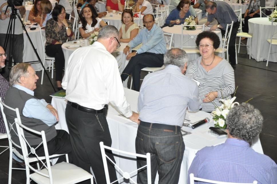 Na mesa em 1º plano - da esq. para dir.: n.i., prof. pe. Francisco Ivern Simó S.J. (Vice-Reitor), prof. pe. Josafá Carlos de Siqueira S.J. (BIO, Reitor), prof. Augusto Sampaio (Augusto Luiz Duarte Lopes Sampaio) (COM, Vice-Reitor para Assuntos Comunitários) e o prof. Sérgio de Almeida Bruni (Vice-Reitor para Assuntos de Desenvolvimento)