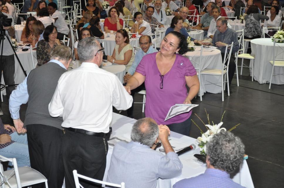 A funcionária Marise Lira de Sousa Teixeira recebe os cumprimentos do Reitor Padre Josafá S.J. pelos 30 anos de dedicação à PUC-Rio.