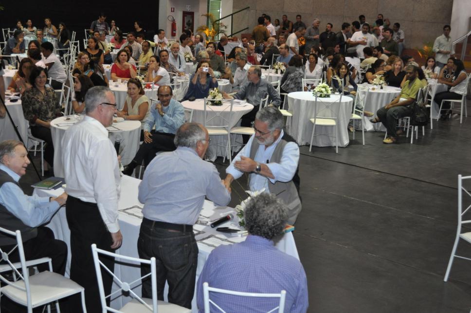 O professor Adair Leonardo Rocha recebe os cumprimentos do professor Augusto Sampaio pelos 30 anos de dedicação à PUC-Rio.