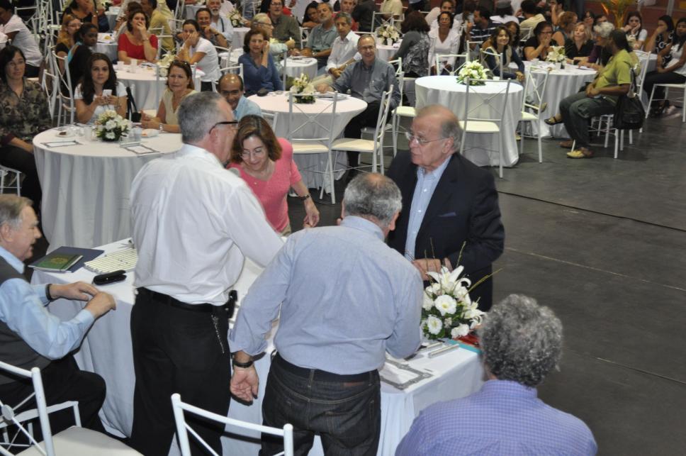 O professor Pedro Paulo Cristofaro recebe os cumprimentos do Reitor Padre Josafá S.J. em agradecimento aos 35 anos de dedicação à PUC-Rio.