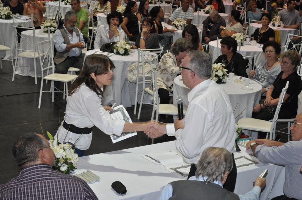 O Reitor Padre Josafá S.J. cumprimenta a funcionária homenageada no evento.
