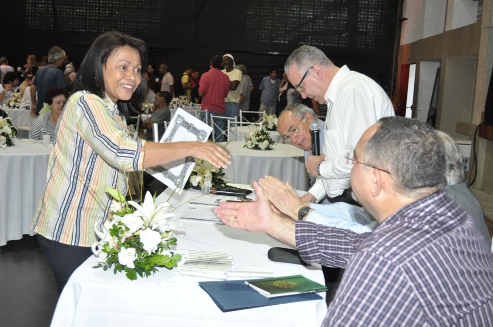 A funcionária Maria Alcina recebe o diploma de Honra ao Mérito pelos 30 anos de dedicação à PUC-Rio.