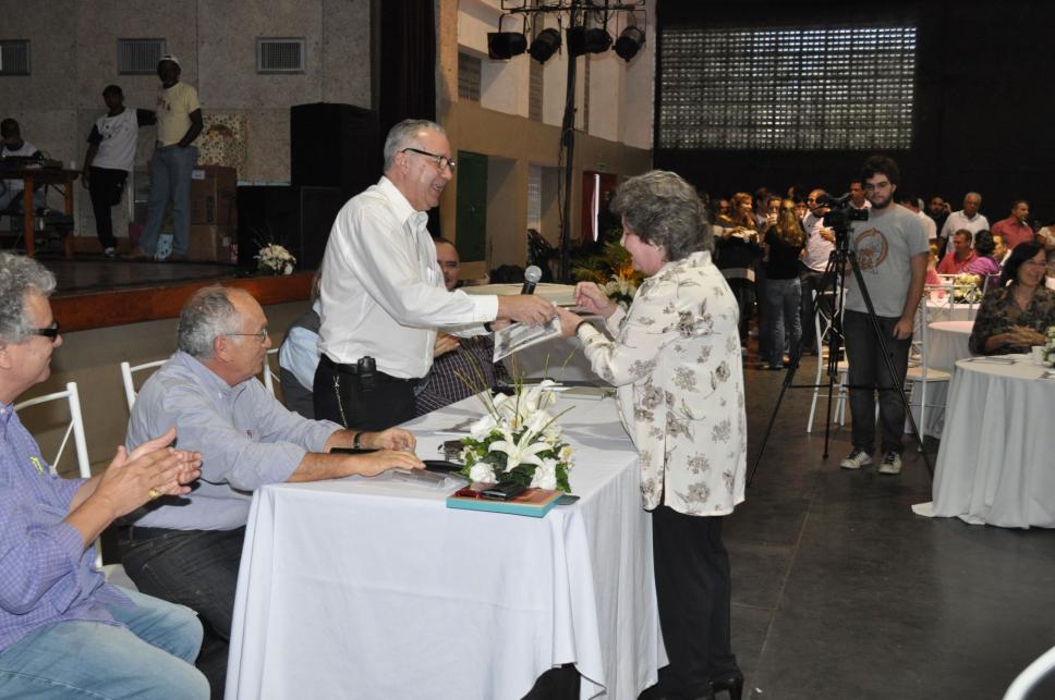 A professora profa. Inês recebe o diploma de Honra ao Mérito do Reitor Padre Josafá S.J. durante a homenagem.