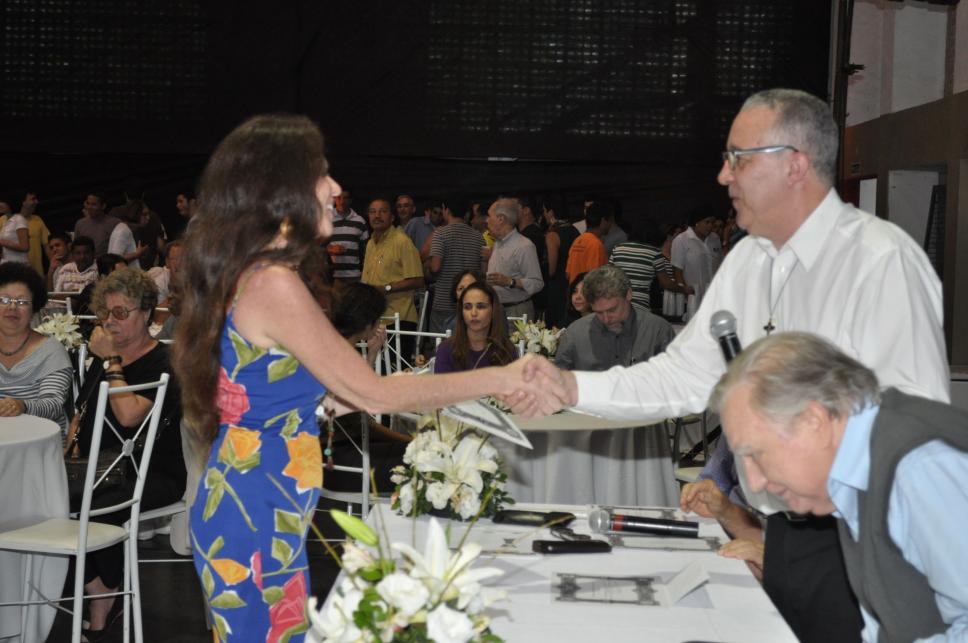 A funcionária homenageada recebe o diploma de Honra ao Mérito do Reitor Pe. Josafá S.J..