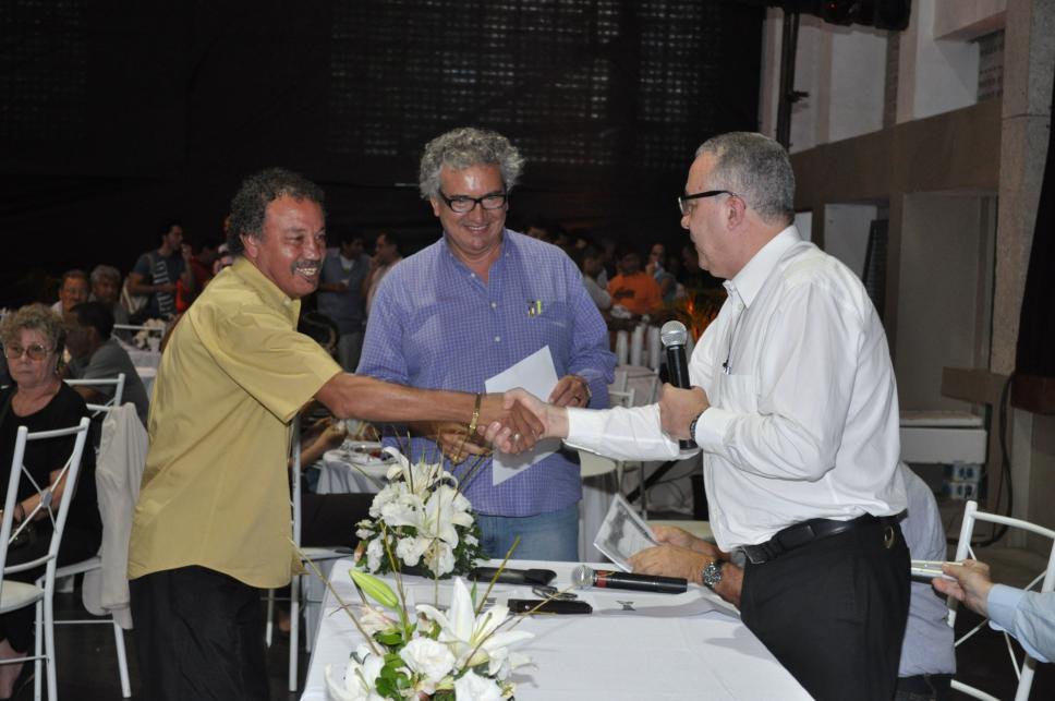 Funcionário recebe os cumprimentos do Reitor Padre Josafá S.J. durante a homenagem.