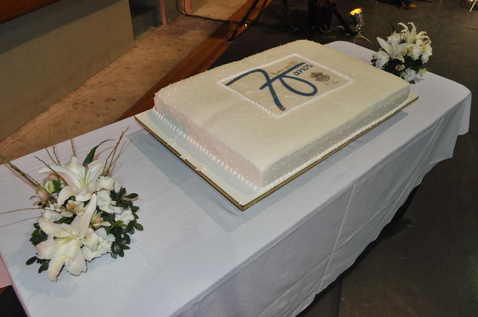 Bolo com logotipo do aniversário de 70 anos de fundação da PUC-Rio servido na homenagem.