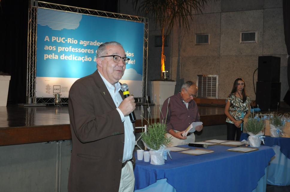 O Reitor Padre Josafá S.J. fala na abertura do evento em homenagem aos funcionários e professores.