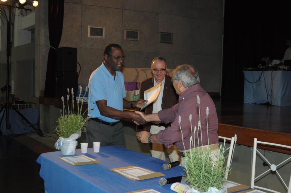 O funcionário Isnarde Antonio Ernesto recebe os cumprimentos do prof. Augusto Sampaio pelos 45 anos de dedicação à PUC-Rio.