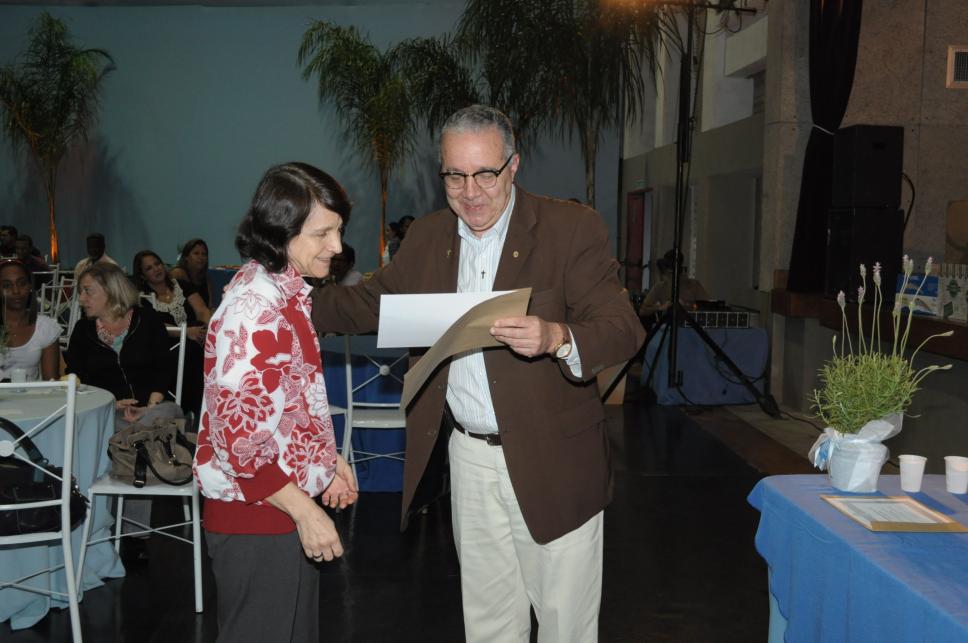 A professora Tereza Cavalcanti recebe o diploma de Honra ao Mérito do Reitor Padre Josafá S.J. em homenagem aos 40 anos de dedicação à PUC-Rio.