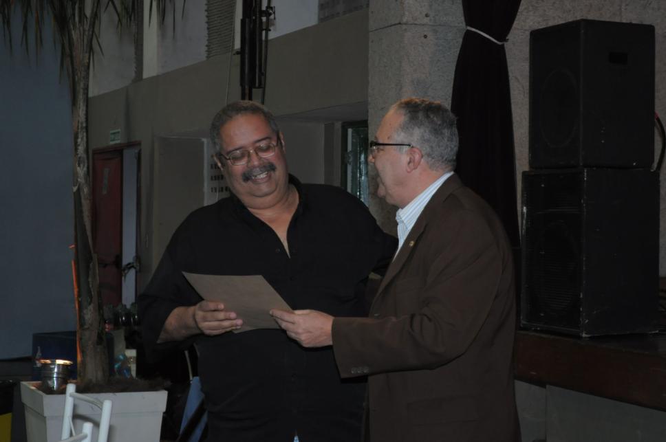 O Reitor Pe. Josafá S.J. entrega o diploma de Honra ao Mérito ao funcionário Marcelo Arjona em agradecimento aos 35 anos de trabalho na PUC-Rio.