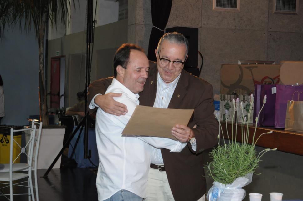 O Reitor Pe. Josafá S.J. cumprimenta e entrega o diploma de Honra ao Mérito ao funcionário homenageado.