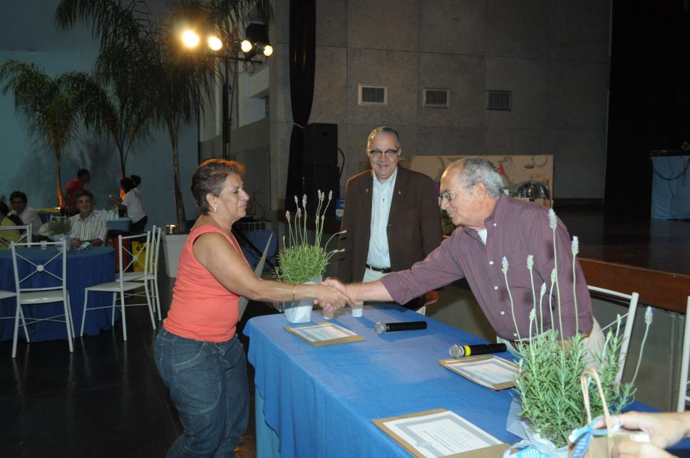 Funcionária homenageada recebe os cumprimentos do prof. Augusto Sampaio durante a cerimônia.