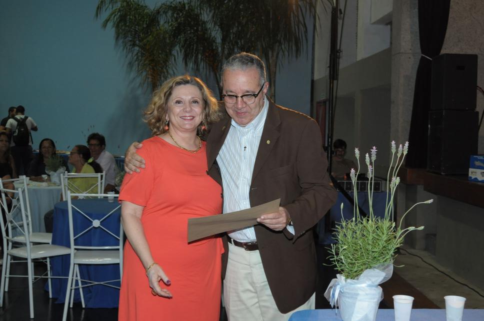 A professora Rosa Marina Meyer recebe do Reitor Padre Josafá S.J. o diploma de Honra ao Mérito em agradecimento aos 35 anos de trabalho na PUC-Rio.