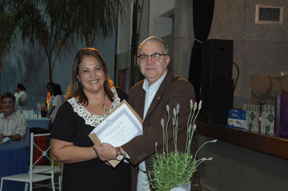A funcionária Zenaide Maria Olivetti recebe do Reitor Padre Josafá S.J. o diploma de Honra ao Mérito pelos 30 anos de trabalho na PUC-Rio.