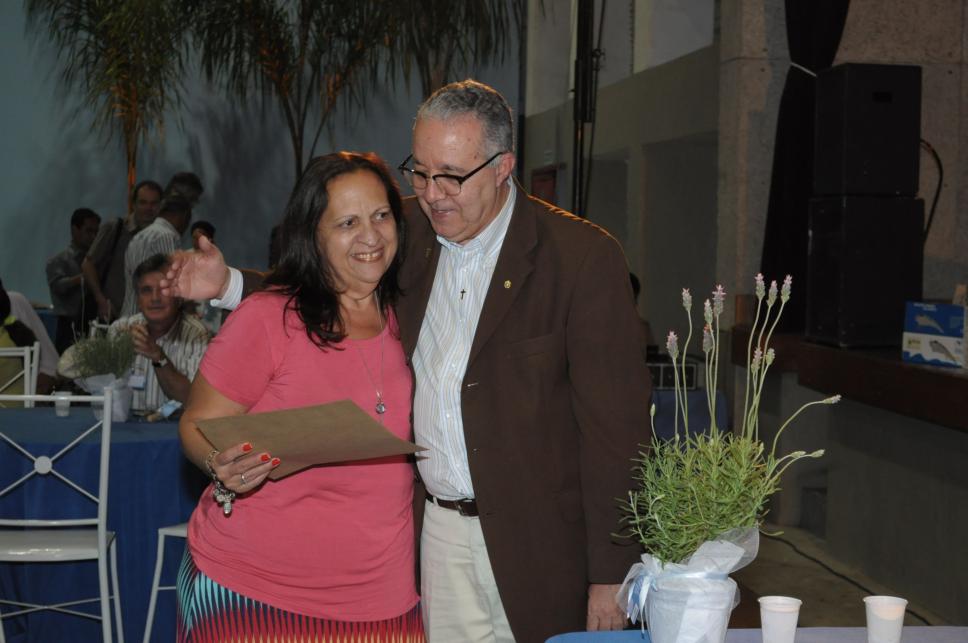 A funcionária Ana Lúcia da Silva, com o diploma de Honra ao Mérito, recebe os cumprimentos do Reitor Padre Josafá S.J. em agradecimento aos 25 anos de dedicação à PUC-Rio.
