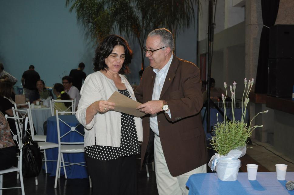 A professora Maria Paula Frota recebe o diploma de Honra ao Mérito do Reitor Padre Josafá S.J. em homenagem aos 35 anos de dedicação à PUC-Rio.