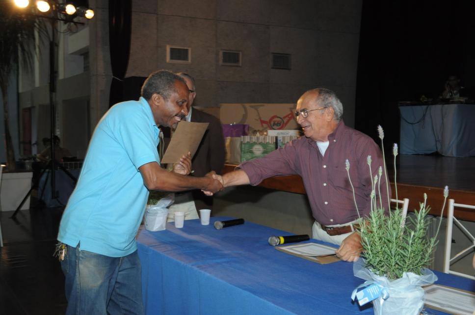 O funcionário Gilson Souza recebe os cumprimentos do Vice-Reitor Comunitário, prof. Augusto Sampaio, em agradecimento aos 25 anos de dedicação à PUC-Rio.