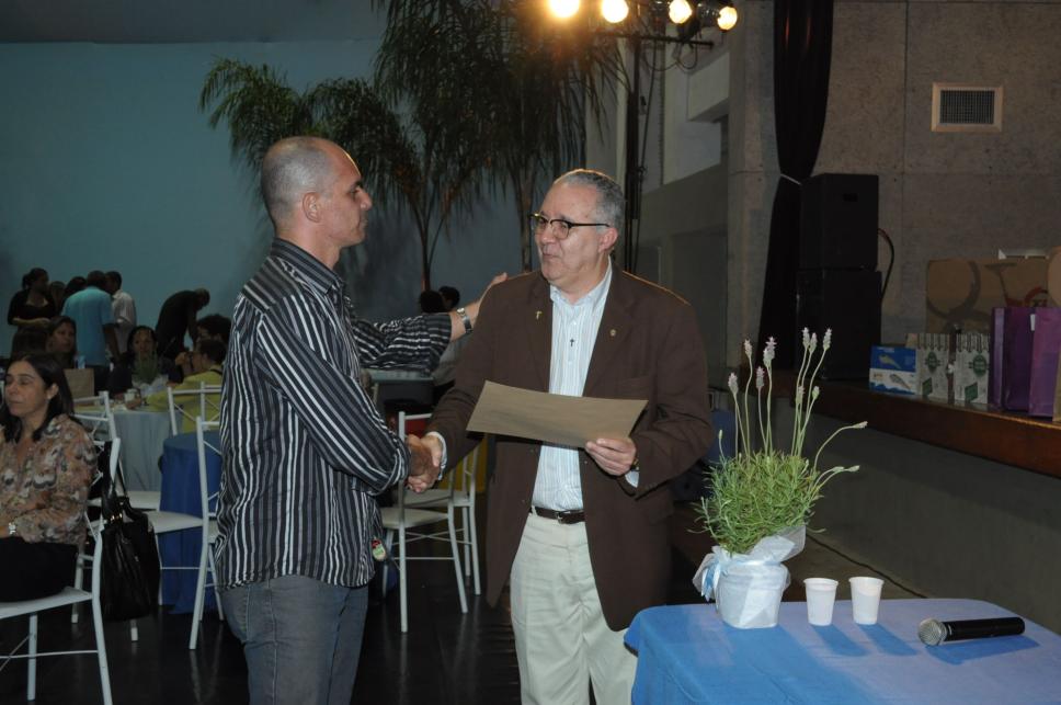 O Reitor Padre Josafá S.J. entrega o envelope com o diploma de Honra ao Mérito ao funcionário homenageado.