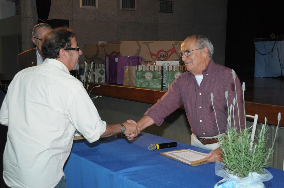 O professor Júlio Cesar Diniz recebe os cumprimentos do Vice-Reitor Comunitário, prof. Augusto Sampaio, em agradecimento aos 25 anos de dedicação à PUC-Rio.