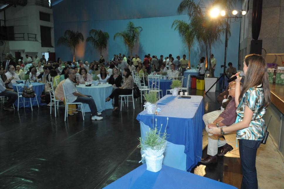 A funcionária Suzana de Mattos Kerber (CACC) ao microfone durante a homenagem aos funcionários.