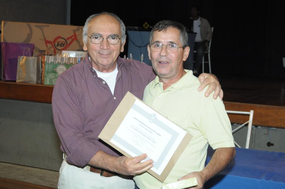 O Vice-Reitor Comunitário, professor Augusto Sampaio, entrega o diploma de Honra ao Mérito ao funcionário Euclides Domingues pelos 25 anos de dedicação à PUC-Rio.