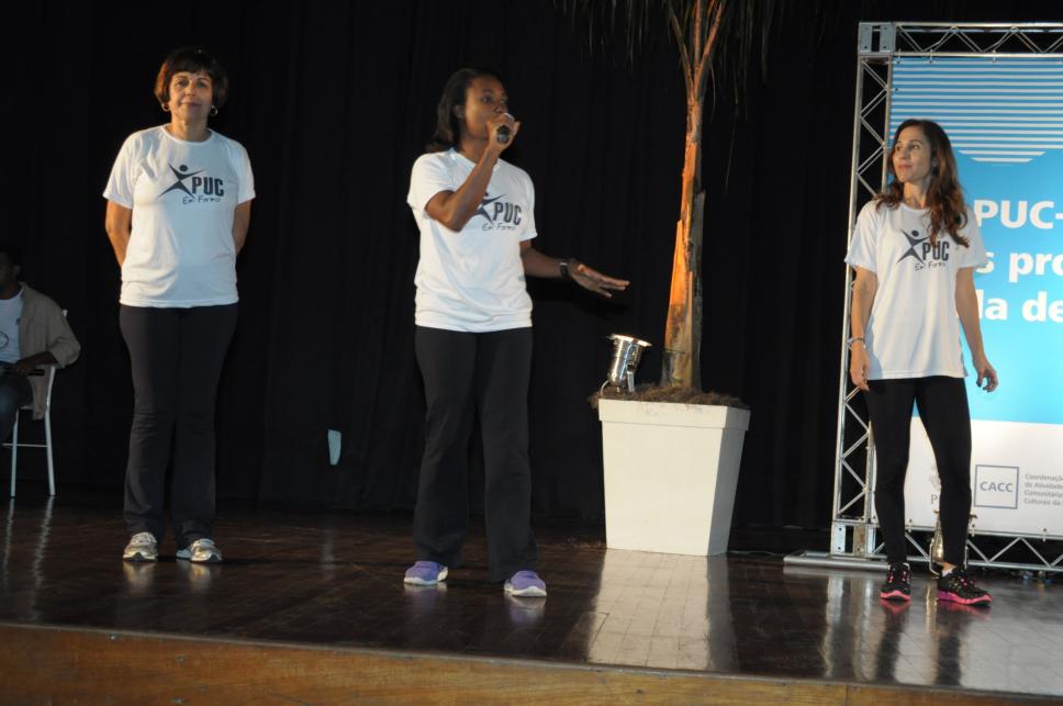 Monitoras do projeto PUC em Forma comandam atividades físicas e danças com a participação dos funcionários e professores homenageados.