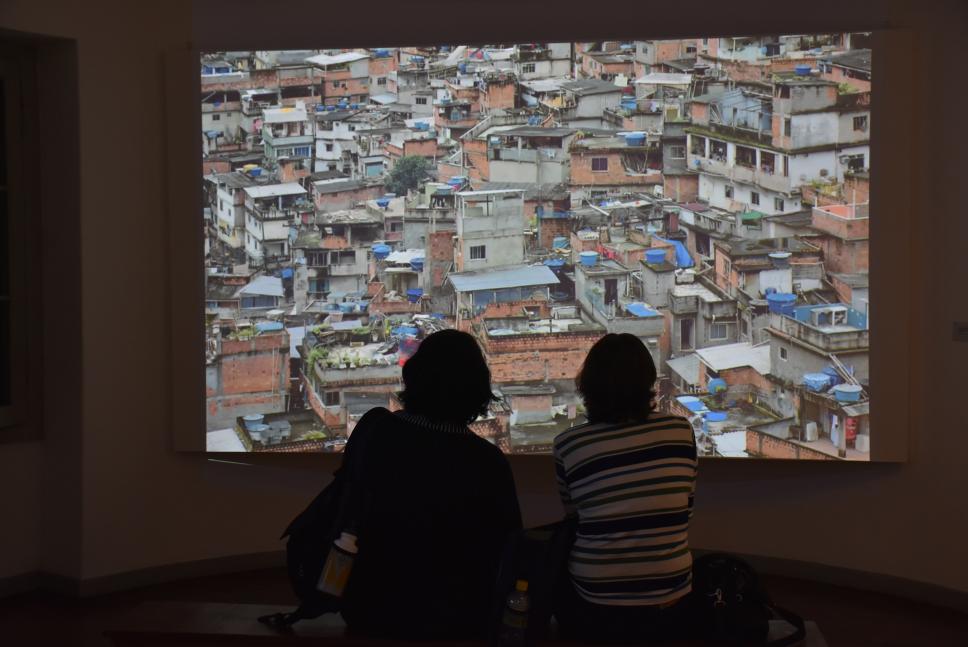 Visitantes observam as fotos projetadas da Rocinha, de autoria do fotógrafo Robert Polidori, na sala "Expansão e resistência" da exposição "Gávea - Território de Diversidades, Morada de Contradições".