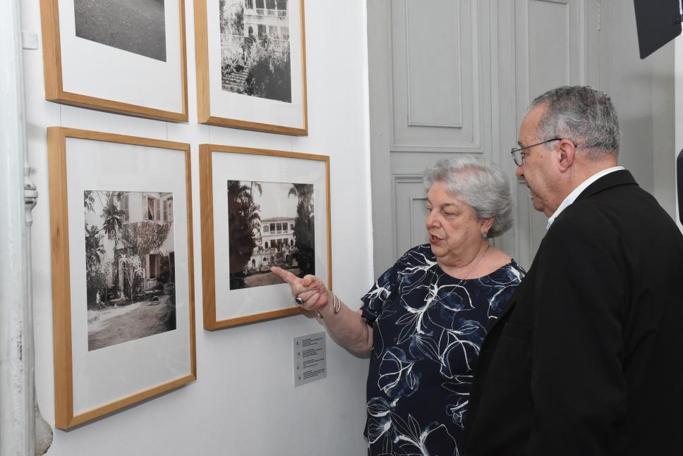 O Reitor Pe. Josafá S.J. e a professora Margarida visitam a sala "Duas casas" da exposição "Gávea - Território de Diversidades, Morada de Contradições".