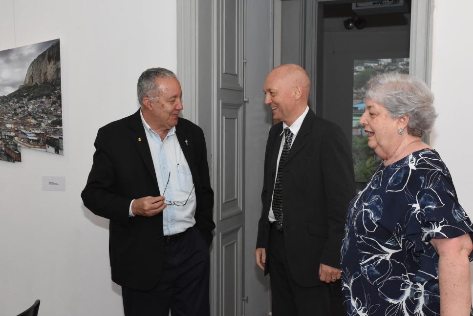 Da esq. para dir.: prof. pe. Josafá Carlos de Siqueira S.J. (BIO, Reitor), prof. Karl Erik Schøllhammer (LET) e a profa. Margarida de Souza Neves (Núcleo de Memória, Solar Grandjean de Montigny)