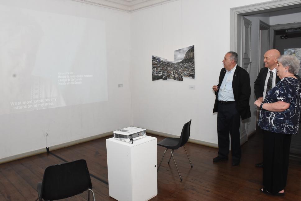 O Reitor Pe. Josafá S.J., o prof. Karl Erik e a prof. Margarida observam os vídeos com depoimentos de moradores da Rocinha, projetados na sala "Expansão e resistência", da exposição "Gávea - Território de Diversidades, Morada de Contradições".