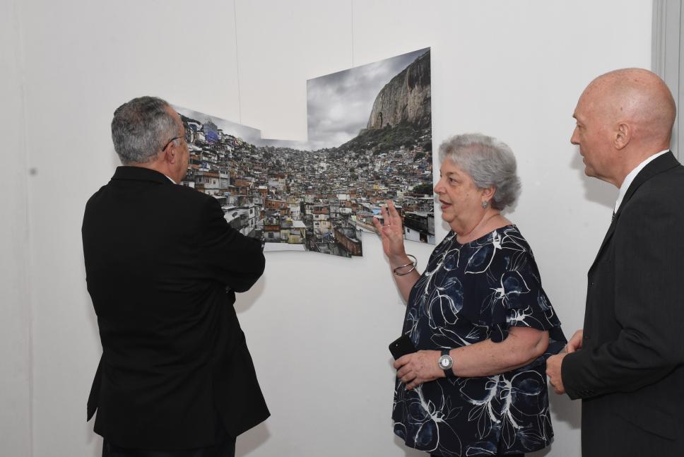 A profa. Margarida mostra foto da Rocinha exposta na exposição "Gávea - Território de Diversidades, Morada de Contradições", de autoria do fotógrafo Robert Polidori, para o Reitor Pe. Josafá S.J. e o prof. Karl Erik.